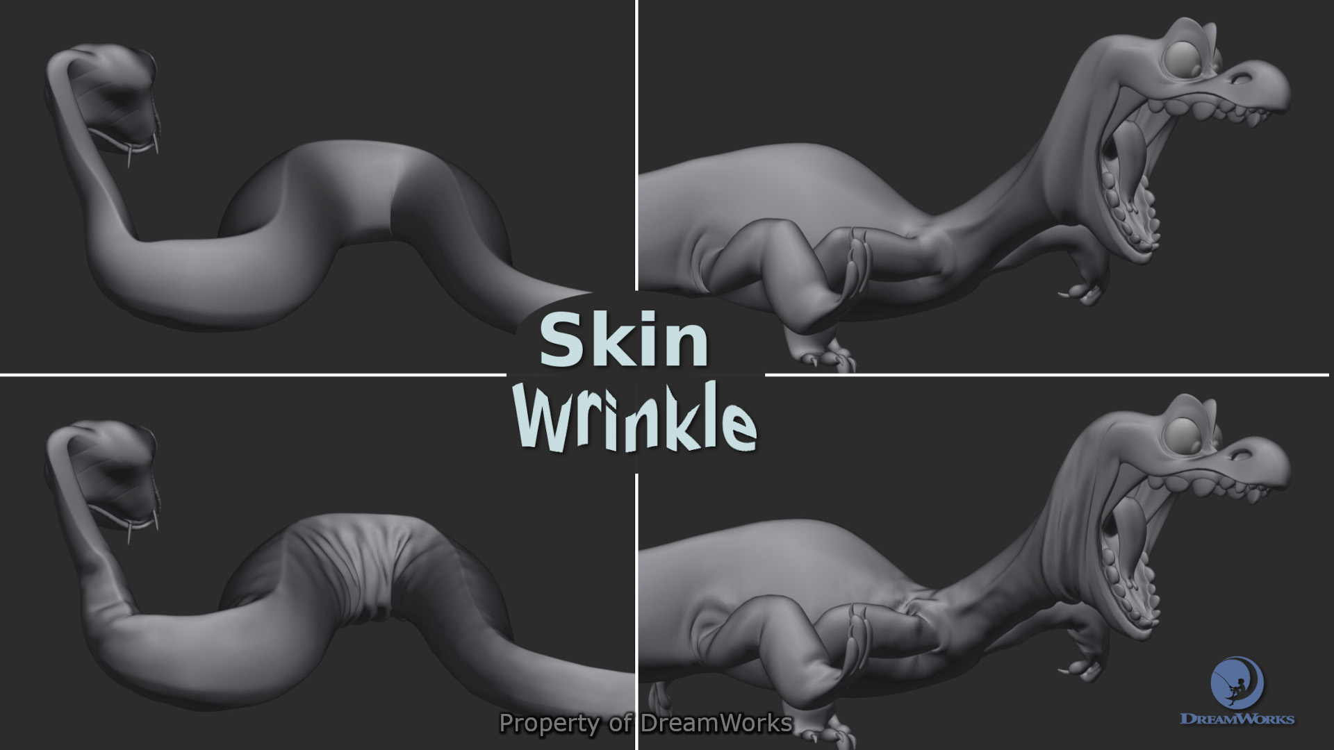 Skin Wrinkle is a time-independent custom deformer tool at DreamWorks that produces wrinkles in the animated skin mesh geometry solely based on the incoming animated and rest skin meshes and artist-specified parameters. The deformer minimizes volume loss, performs continuous self-collision detection and resolution, and enriches the character’s look.