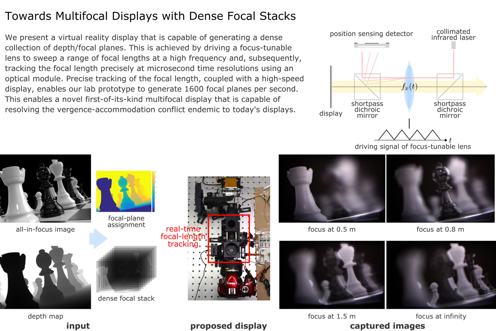 We present a virtual reality display that is capable of generating a dense collection of depth/focal planes. This is achieved by driving a focus-tunable lens to sweep a range of focal lengths at a high frequency and, subsequently, tracking the focal length precisely at microsecond time resolutions using an optical module. Precise tracking of the focal length, coupled with a high-speed display, enables our lab prototype to generate 1600 focal planes per second. This enables a novel first-of-its-kind virtual reality multifocal display that is capable of resolving the vergence-accommodation conflict endemic to today’s displays.