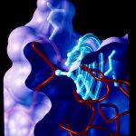 1. Michael Pique, Research Institute of Scripps Clinic, Department of Molecular Biology-Scripps Clinic, !0666 North Torrey Pines Road, La Jolla CA 92037, (619) 4579775. Proposed antibody-binding mechanism. The normally buried 6-sided tyrosine ring rotates to be outside the normal surface of the protein myohemerythrin when it is recognized by an antibody molecule (not shown). Rendered with sphere, cylinder and torus primitives using a linked-list volume model. Michael Connolly’s “M CS” Molecular Cross Section program on a Convex C-1 computer and Sun-3 workstation with 8-bit frame buffer.?