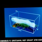 4. Stefen M. Faugmeier, Omnibus Simulations, 3416 S. La Cienega Blvd., Los Angeles, CA 90016, (213) 938-1111. Jetstream Field. Jetstream field over the Eastern half of the United States with sea level pressure contours. Stefen M. Faugmeier using ISOSURF model generator, DP3D proprietary rendering software on a Cray XMP/22 with VAX 11 / 782 front end and high-resolution digital film printer.?