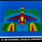 6. Diane L. Hauser, McDonnell Douglas Corporation, Int. Mail Code 36-81, 3855 Lakewood Blvd., Long Beach, CA 90816 (213) 593-6681. CFO Solution. Subsonic panel method flow solution of the MD-87 with flux plane. View generated in real time by ARTIS CAE/ Post-processing package. Colors indicate pressures. By Diana Hauser, John Zulvaf and Doug Friedman using ARTIS, DACVINE on an IRIS 3030 and IBM 3081.?