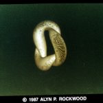 8. Alyn Rockwood, Evans & Sutherland Computer Corp., 580 Arapeen Drive, P.O. Box 8700, Salt Lake City, UT 84108, (801) 582-5847 x4906. Three slugs playing ‘ring around the rosies’. Stereographic projection from 4D to 3-D of the classification space of homogeneous third degree polynomials in two variables (the “umbilic bracelet”). Texturing added later. By Alyn Rockwood on an E & S PS340 and VAX l l/780.?