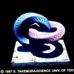 11. Shinichi Takemura, Science University of Tokyo, 1-14-18, Gohongi, Meguro-Ku, Tokyo, 153 JAPAN 03-712-0850. Double Torus. The section of each torus is a round-cornered square by super-quadratic function. The pattern on a marble-imitated base is an application of cell-automation. By Sinichi Takemura using software he developed on a PC 9801 VM2 computer, FREE-16M frame buffer and MC 1000 digital video copy.?