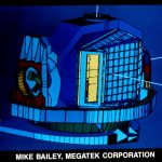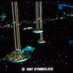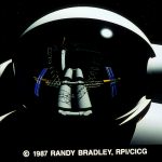 62. Randy Bradley, Center for Interactive C. G ., Rensselaer Polytechnic Institute, Troy, NY 12180, (518) 266-6751. Shuttlestop. This ray traced image (1280 x 1024) reflects the latest dual-keel Spacestation design in the faceplate of an astronaut’s helmet, while the sun reflects as well. Modeling utilized superquadric primitives throughout. Dubbed “Shuttlestop” as the terminus for the shuttle and the next stop for man in space. By Randy Bradley using the Clockworks image synthesis/ simulation system. Developed by the RPI/ CICG animation group running on the DG MV-10000, Raster Tech One/380, E&S PS300 and Dunn 635.?