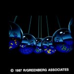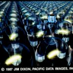 15. Jim Dixon, Pacific Data Images, 1111 Karlstad Drive, Sunnyvale, CA 94089, (408) 7456755. 793,900 polygons were rendered with the bulbs reflecting a beach in the Virgin Islands. The “glass” is transparent with an angular dependency, increasing the perception of density. By Jim Dixon on the Pacific Data Images proprietary animation system with Ridge computers and Raster Tech frame buffer.?
