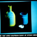 18. Arie E. Kaufman, Department of Computer Science, SUNY at Stony Brook, NY 11794-4400, (516) 632-8441. Bottle and Glass. A geometric model of cylinders is scan-converted into 1283 cubic frame buffer of voxels, and projected and rendered with semi-transparent bottle and glass and discrete shading. By Kaufman and Liow using Sun Core, Sun View and CUBE architecture software on a Sun 3-160C.?