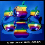 22. David E. Breen, Center for Interactive C.G., Rensselaer Polytechnic Institute, Troy, NY 12180, (518) 266-6482. Apple Gallery #2. This is a ray traced image where the apples are extruded polygons intersected with superquadrics. By David E. Breen using the Clockworks Computer Animation System on a Data General MV / 10000, E&S PS300, Raster Technologies Model I/ 20 and Dunn Instruments Camera 635.?