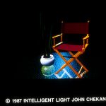 25. John Chekan, Intelligent Light, P.O. Box 65, Fairlawn, NJ 07410, (201) 794-7550. On Worms. Detailed textured model of directors chair with potted plant and textured base. By John Chekan using Intelligent Light GW-3000 workstation, Apollo workstations, Ikonas frame buffer and Dunn 632 film recorder.?