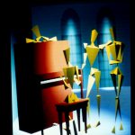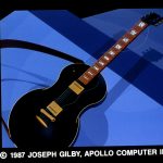 26. Joseph Gilby, Apollo Computer, MS CHF-02-RD, 330 Billerica Road, Chelmsford, MAO 1824, (617) 256-6600 x7582. B-String Blues. The slide shows various linearly distorted primitives, a bicubic surface tessellated with cylinder sections and two FEM ‘strings’released under tension, acting as environmentally sensitive automata. James Arvo and David Kirk created the turbulent solid texture software for the pearl inlays and the ray classification, 5-space algorithm. The 512 x 480 x 24 image was computer in one hour on eight various Apollo nodes (networked 570’s, 580’s, 580T’s and 3000’s -scene distributed into 8 strips).?