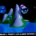 34. Melvin L. Prueitt, Los Alamos National Laboratory, MS-0415, Los Alamos, NM 87545, (505) 667-4452. A Quiet Day. The transparent spheres have reflection and refraction. The water has reflection. Produced on a Cray computer with Dicomed film recorder. Software by M. L. Prueitt.?