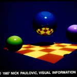 35. Nick Paulovic, Visual Information Inc., P.O. Box 1674, West Covina, CA 91793. Untitled. Raytraced on a Macintosh Plus taking 12 hours. Displayed upon a Macintosh II computer with the SuperMac Spectrum 1024 graphics board and the Amtron 19″ monitor.?