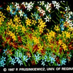 41. Przemyslaw Prusinkiewicz, University of Regina, Department of Computer Science, Regina, Sask., Canada S4S 0A2, (306) 584-4061. Flower Field. Sixteen plants with flowers, modeled using a stochastic Lsystem. The randomness is introduced to provide specimen-tospecimen variations within a species. An in-house developed software package was used for modeling plants based upon the Lindenmayer systems. The computer was a Sun 2/ 160.?