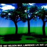 43. Nelson Max, L 30 I, Lawrence Livermore National Lab, P.O. Box 808, Livermore, CA 94550, (415) 422-4074. Light Beams. The bark bump map was measured from actual maple bark and rendered with shadows from the bumps. The shadows ofleaves on the ground and in the haze were computed as described in SIGGRAPH ’86 proceedings pages 117-124. By Nelson Max and Jules Bloomenthal using a Cray XMP computer with the Dicomed D48 color film recorder.?