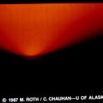 57. Mitchell Roth, University of Alaska-Fair banks, Department of Mathematical Science, JO I Chapman Bldg., Fairbanks, AL 99775, (907) 474-7098. Sunset on Mach Bay. The shading of a curved surface approximated by non-planar polygons is illustrated in this image. The surface is a section of a cylinder viewed from the inside with decreasing radius from left to right. The cylinder is approximated by three nonplanar quadrilaterals. The inside of the cylinder is illuminated by a light source using a fast Phong shading technique. Specular reflection in the top half of the image resembles a sunset, while diffuse reflection in the lower half of the cylinder creates intensity contours resembling waves on a beach. The apparent crests and troughs in these waves are an illusion caused by the Mach effect. In reality each “wave” is a uniformly illuminated contour at one of 64 intensity levels. By M. Roth and C. Chauhn using C language polygon shading routines running on a Masscomp MC-5500 workstation.?