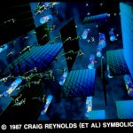 61. Craig W. Reynolds, Symbolics, Inc., Graphics Division, 1401 Westwood Blvd., Los Angeles, CA 90024, (213) 478-0681. Behavioral Animation of Schools and Flocks. This image is a frame from “Stanley and Stella in: Breaking the Ice” (Film show SIGGRAPH ’87.) We are looking up from Stella’s world, in the foreground is a school of stylized fish and in the distance through the city barrier we see a flock of birds. The motion of the flock and school is determined by a distributed model based on the behavior of each individual fish or bird as it responds to its local environment. Produced by the combined production staff of Symbolics Graphics Division, Whitney/ Demos Productions and Hitman of Design. Used the Symbolics “S-” software. Behavioral animation created with the Boids system which is layered on top of S-Geometry and S-Dynamics on a Symbolics 3600 computer.?
