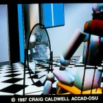 68. Craig Caldwell, Advanced Computer Center for the Arts and Design, 150 I Neil Ave., Columbus, OH 43201, (602) 5234936. What in the World? The background consists of amorphic shapes from animation “metafable.” Room and window were put on top of that. Window is transparent with man’s reflection and light reflection. Man looking put in last. By Craig Caldwell using TWIXT by Julian Gomez and in-house software by Paul MacDougal and John Renner.?