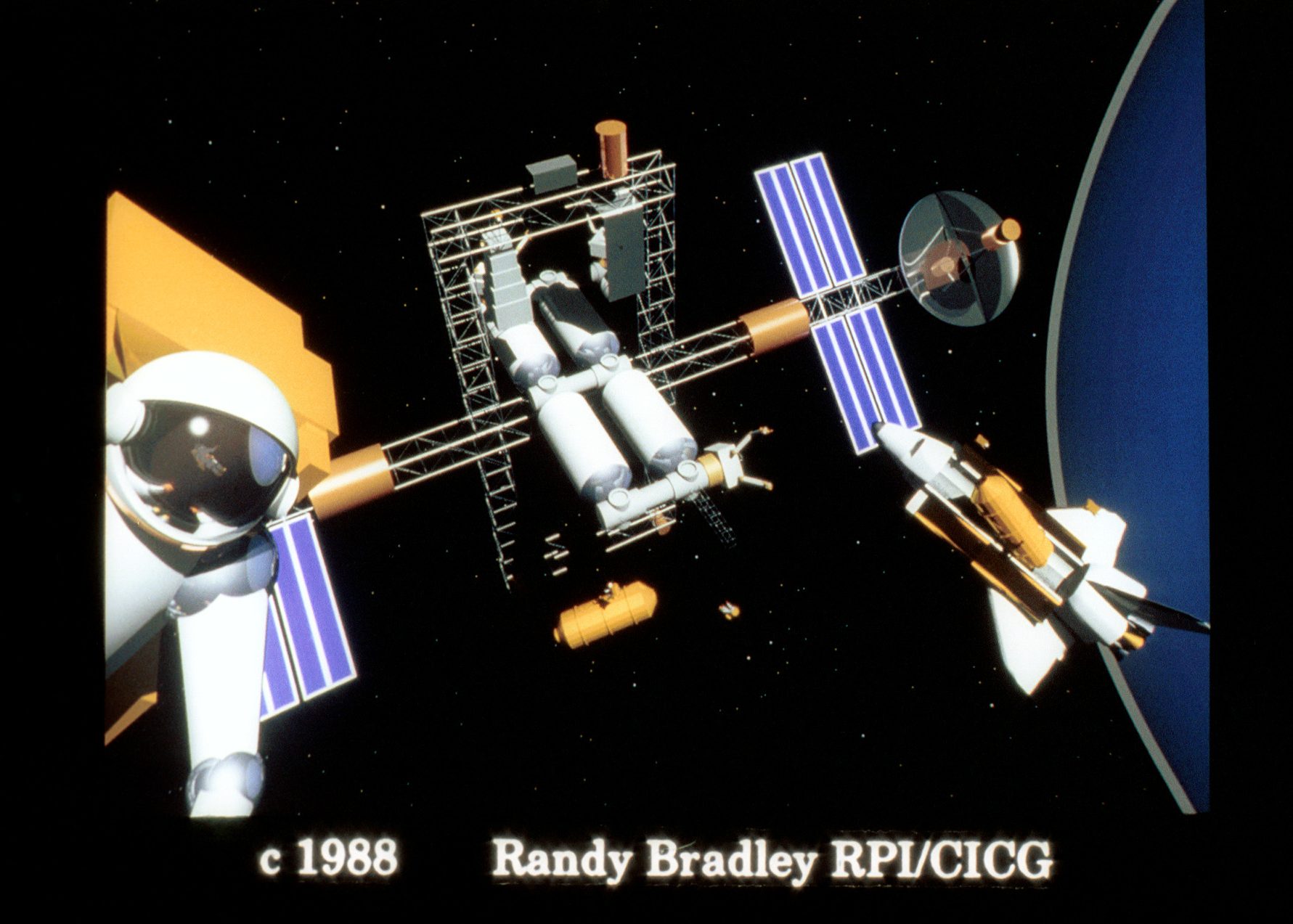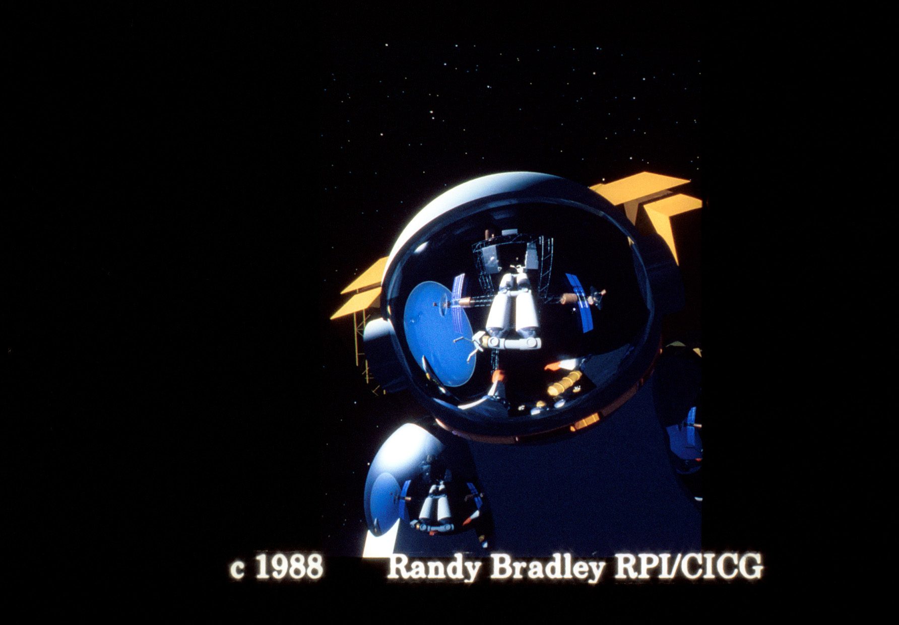 - High Frontier by Randy Bradley. The Clockworks ( CJ CG), an object-oriented visualization system, including raytracing renderer. Sun 4/280, uVAX II, E&S PS300, Raster Tech l / 380, Dunn 635. A 1280×1024 raytraced image showing the high frontierreflected in the faceplate of an astronaut in orbit over the planet. Contact: Randy Bradley, RPI Center for Interactive Computer Graphics, CII 7107, Troy, NY 12180, (518)756-9894.?