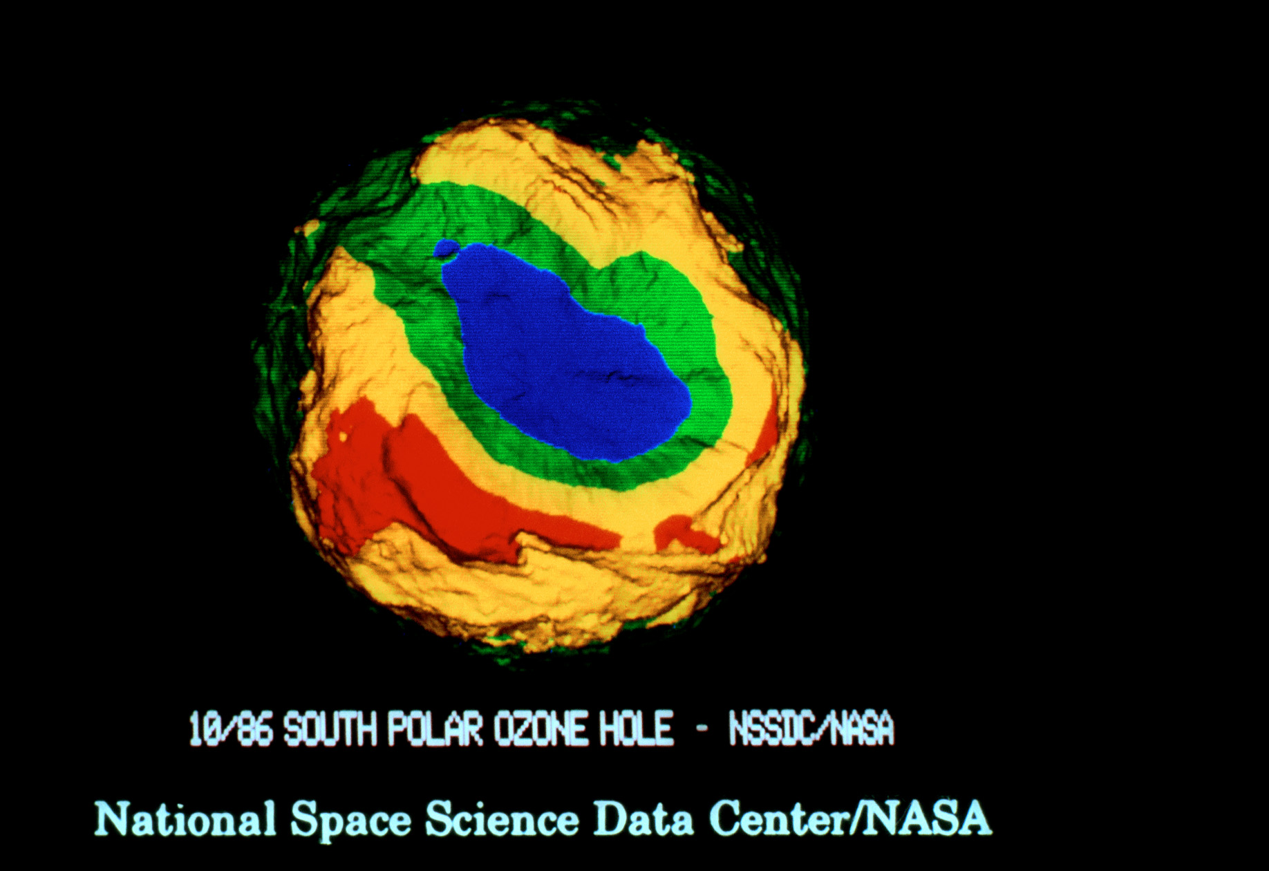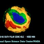 - South Pole Ozone Hole by David Wildenhain, Michael Gough, Craig Goettsche and Lloyd Treinish. NSSDC Graphic System, Common Data Format used on a Dec VAX 8800, 12S frame buffer and a Matrix camera. Daily global ozone for IO/ IO/ 86 from the Total Ozone Mapping Spectrometer aboard NASA’s Nimbus-7 spacecraft. The sphere is deformed from a nominal level according to the amount of total ozone. The radius and the color-scale (blue to red) correspond to total ozone in Dobsom Units from 140 to 540. The view is directly over the South Pole with the prime meridian vertical. The “ozone hole” is quite prominent in the center. Contact: Lloyd A. Treinish, NASA/GSFC-NSSDC (National Space Science Data Center), Code 634, Greenbelt, MD 20771, (301)286-9884.?
