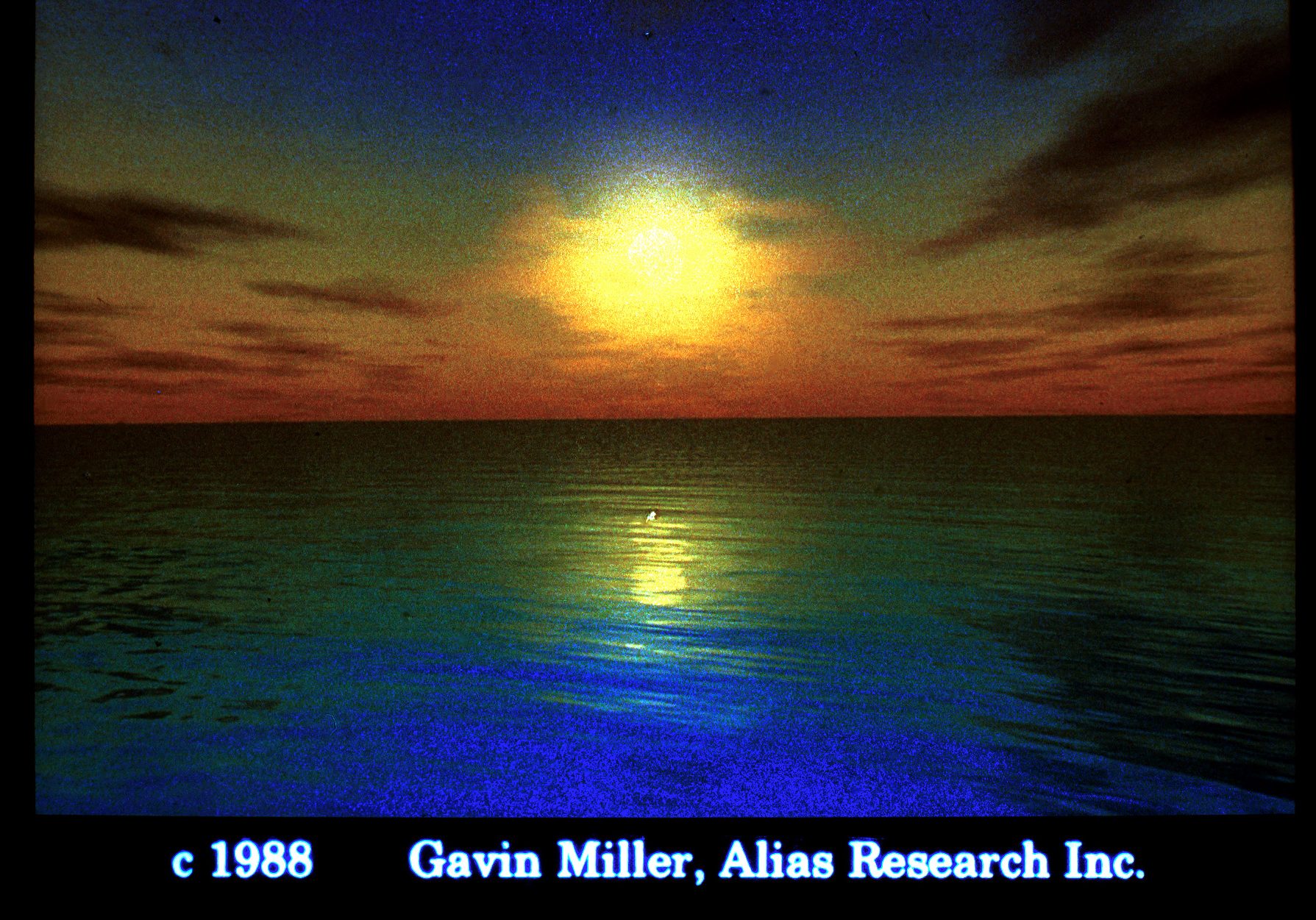 - The Final Sunset by Gavin Miller. Alias 2.3 renderer/ natural phenomena option on Silicon Graphics 4D/70 workstation. This is a single image from an animation showing a sunset followed by the catastrophic effect of a nuclear winter on the atmosphere. Contact: Gavin S. P. Miller, Alias Research, Inc., 110 Richmond St. E., Toronto, Canada, MSC IP I.?