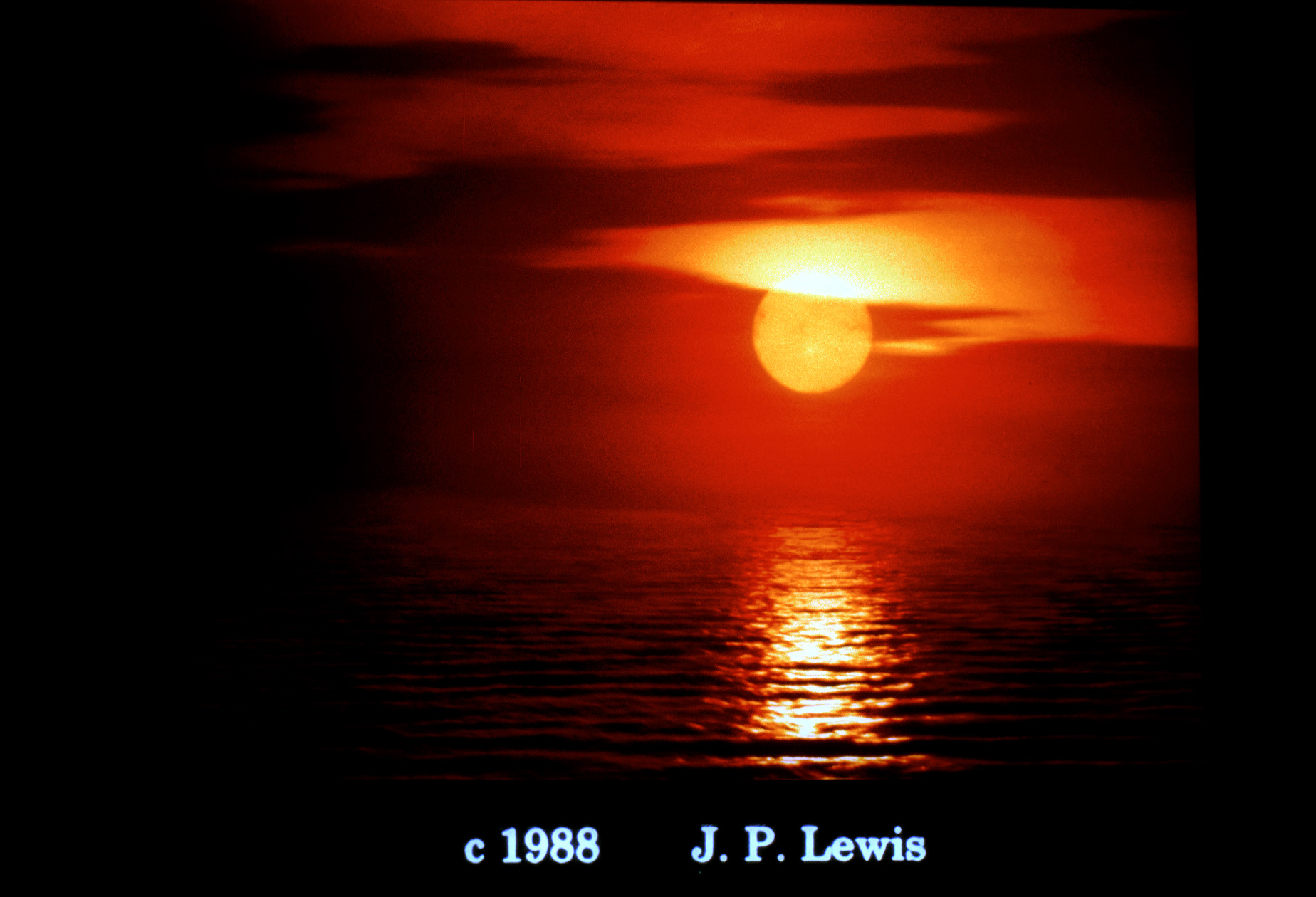 - Stochastic Sunset by J. P. Lewis using NY IT rendering software; stochastic modeling software on the SUN-3 and Dicomed film recorder. Non-fractal waves and clouds molded by generalized stochastic subdivision. Contact: J. P. Lewis, NYIT Computer Lab, Old Westbury, NY, NY 11568, (516) 686-7644.?
