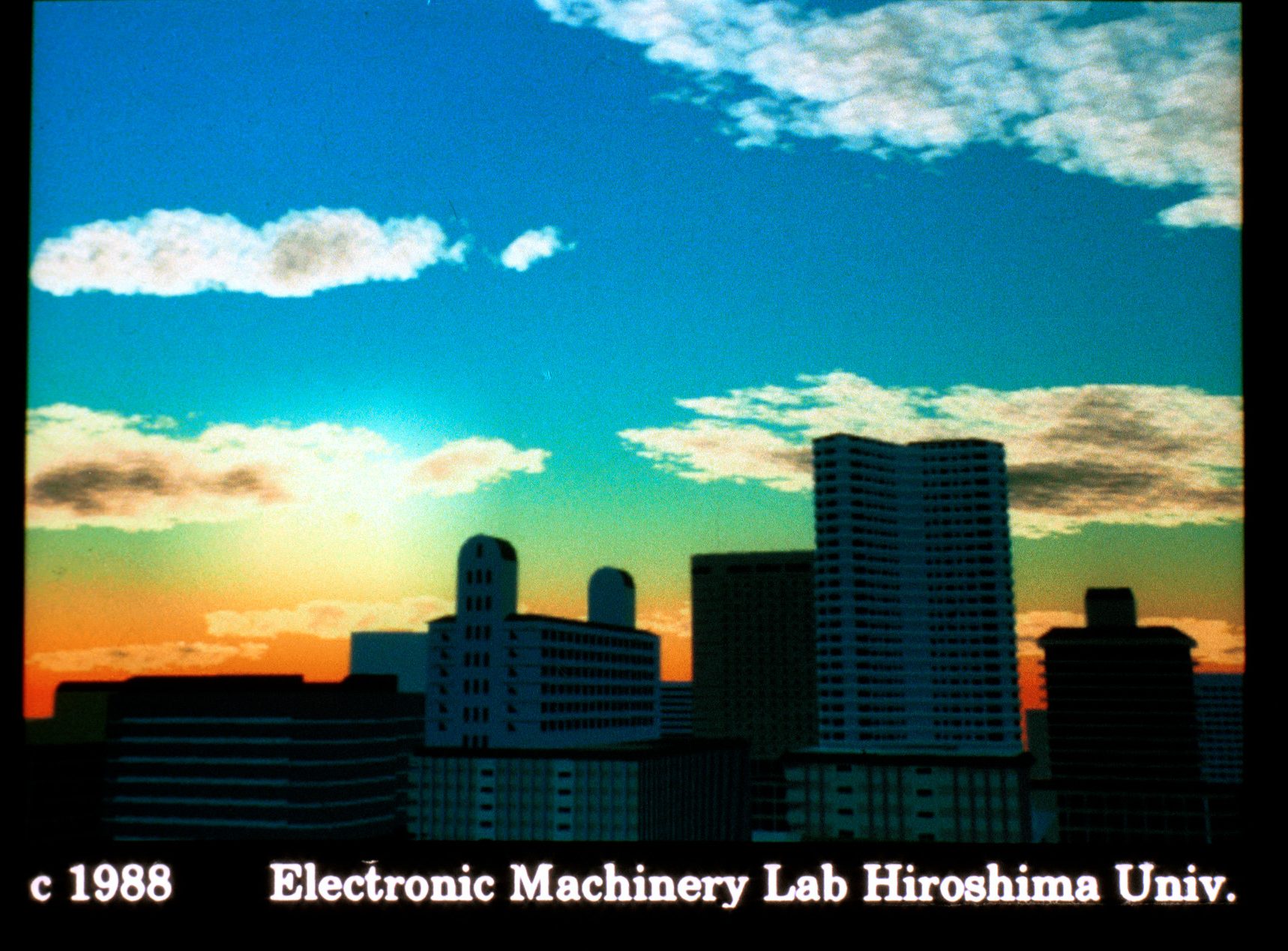 - The Sky by Eihachiro Nakamae and Tomoyuki Nishita, using in house software on the TOSBAC ? Data System 600/80. Sky color: Depicting the spectral distribution of sky radiation considering both scattering and absorbtion due to air molecules and aerosols in the atmosphere. Contact: Eihachiro Nakamae, Electric Machinery Laboratory, Hirsohima University, Saijo-cho, H irsohiH irsohima 724, JAPAN, 082422-7111.?