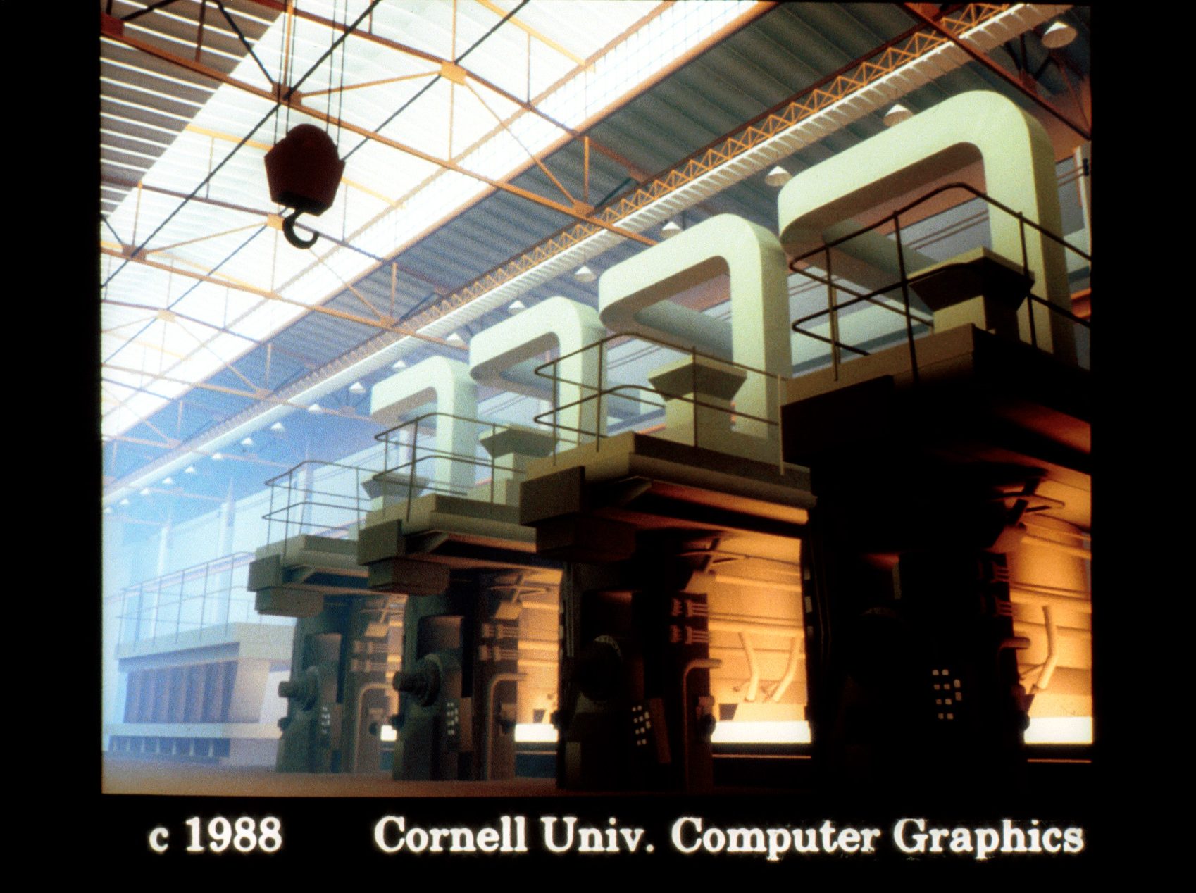 - Steel Mill by Stuart I. Feldman/John R. Wallace using Cornell University Program of Computer Graphics in-house software running on the Digital Equipment VAX 8700 and Hewlett Packard 320 for display. The image was generated in two passes. The global illumination was first estimated using a radiosity progressive refinement approach. This solution was then used to directly solve for the radiosity at 70,000 vertices. This would have been impractical with standard radiosity approaches due to the exhorbitant size and cost of the matrix formation and solution. Contact: Michael Cohen, Program of Computer Graphics, Cornell University, 120 Rand Hall, Ithaca, NY 14853, (607)255-6711.?
