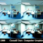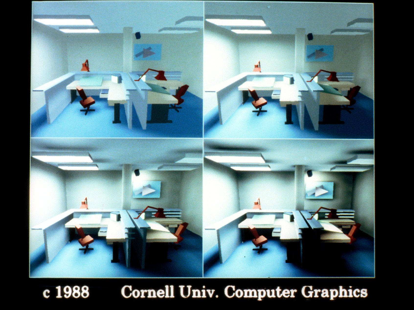 - Progessive Radiosity Solution After I, 2, 24 and I 00 Hemi-cubes by Keith Howie/ Shenchang Eric Chen using the Cornell University Program of Computer Graphics in-house software on the Hewlett Packard 320 workstation with 320SRX graphics accelerator. The images were rendered using a progressive refinement approach to solving the radiosity solution for global illumination. This new approach allows a rapid convergence to final illumination levels and permits viewing of the progessive stages in the solution. The four small images represent the solution after I, 2, 24 and 100 hemi-cube operations have been performed. Contact: Michael Cohen, Program of Computer Graphics, Cornell University, 120 Rand Hall, Ithaca, NY 14853, (607)255-6711.