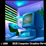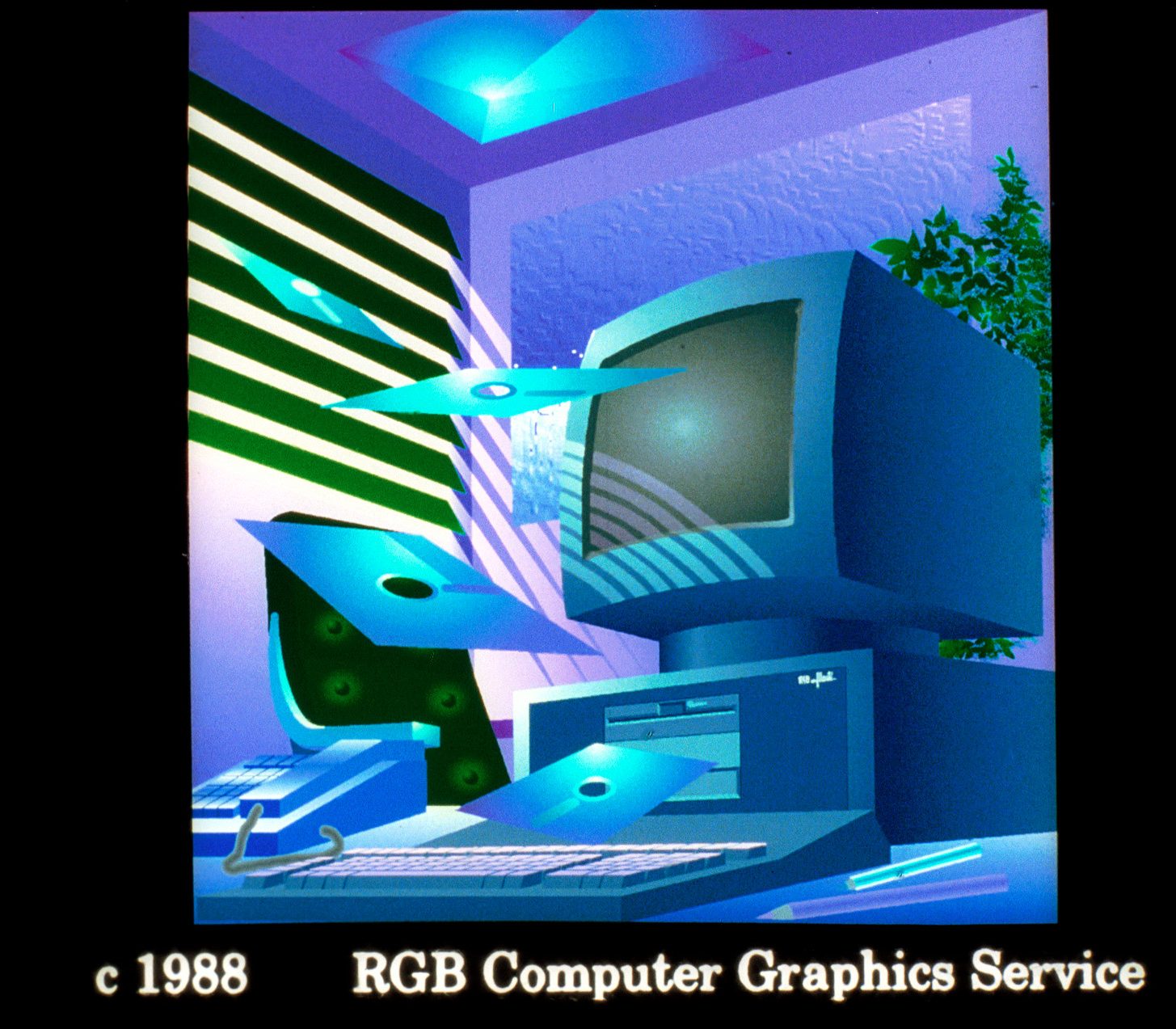 - Computer by Gabriella Monti using Lumena 8 running on the IBM PC AT compatible. Experiment-this image has been completely hand made, using software painting capabilities ( office interior with a close up of the computer). Contact: Tullia Redafill Sprealco, RG B Computer Graphics Service, Viale Piave 17 -Milano/ Italy, 02/783.992 793.223.?