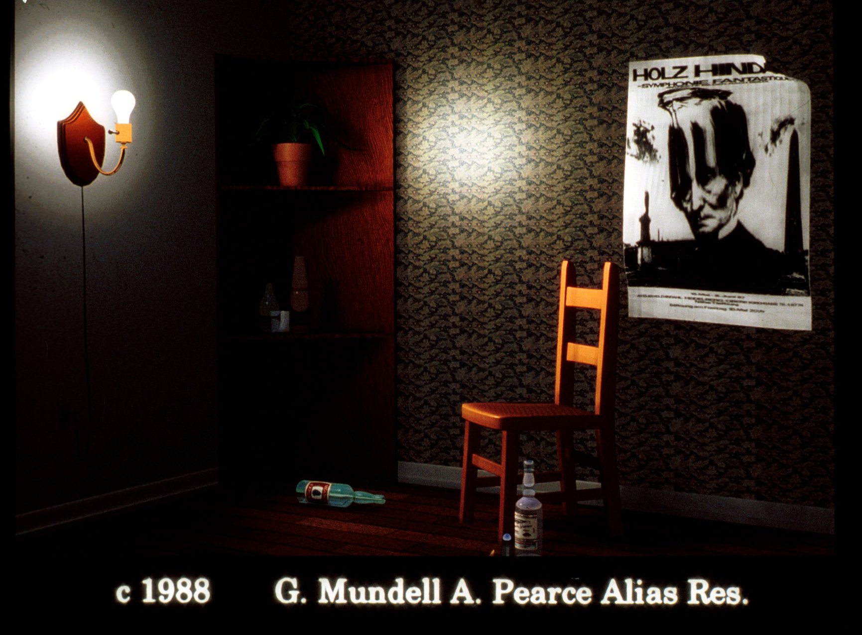 - Room without a View by Gary Mundell and Andrew Pearce using the Alias 12 modeler and renderer running on the Silicon Graphics 40/ 70. Label mapping, solid wood texturing, texture mapping, bump mapping and anti-aliased shadow mapping. This image demonstrates the ability to texture all aspects of ti)e surface characteristics. Contact: Andrew Pearce, Alias Research, I IO Richmond St. E., Toronto, Ontario, Canada, M5C-IPI, (416)362-9181.?