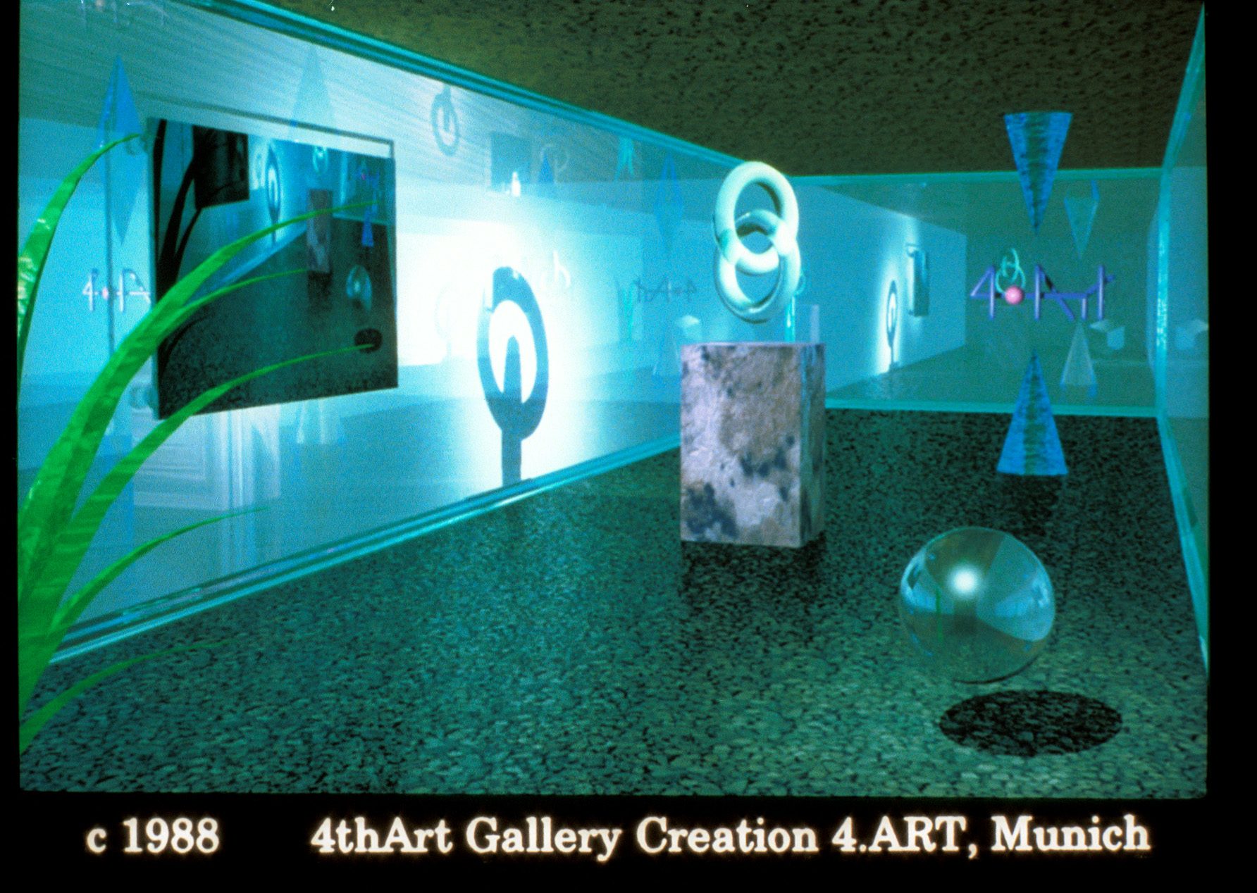 - 4th Art Gallery by Christian D.J. Waschke and Claudius Lazzeroni using the Wavefront 2.6 30 animation package NPS paintand retouch software running on the IRIS 3130 workstation, Sun networkserver, Alliant FX4 rendering I/ 2 inch magtape, PC base paint and retouch station, EI KON IX ( 4K) scanner; digitizertablet. A complex 30 computer graphics still in a fine art style created with all possible effects (ray tracing, reflection mapping, shadow casting, refraction, bump texture mapping, texture design). A gallery of mirrors with 30 objects hanging in the air. Contact: ART GMBH, Kapuzinerstrasse 25 dMunichich 2, West Germany, 0IJ49 89 53 27 96.?