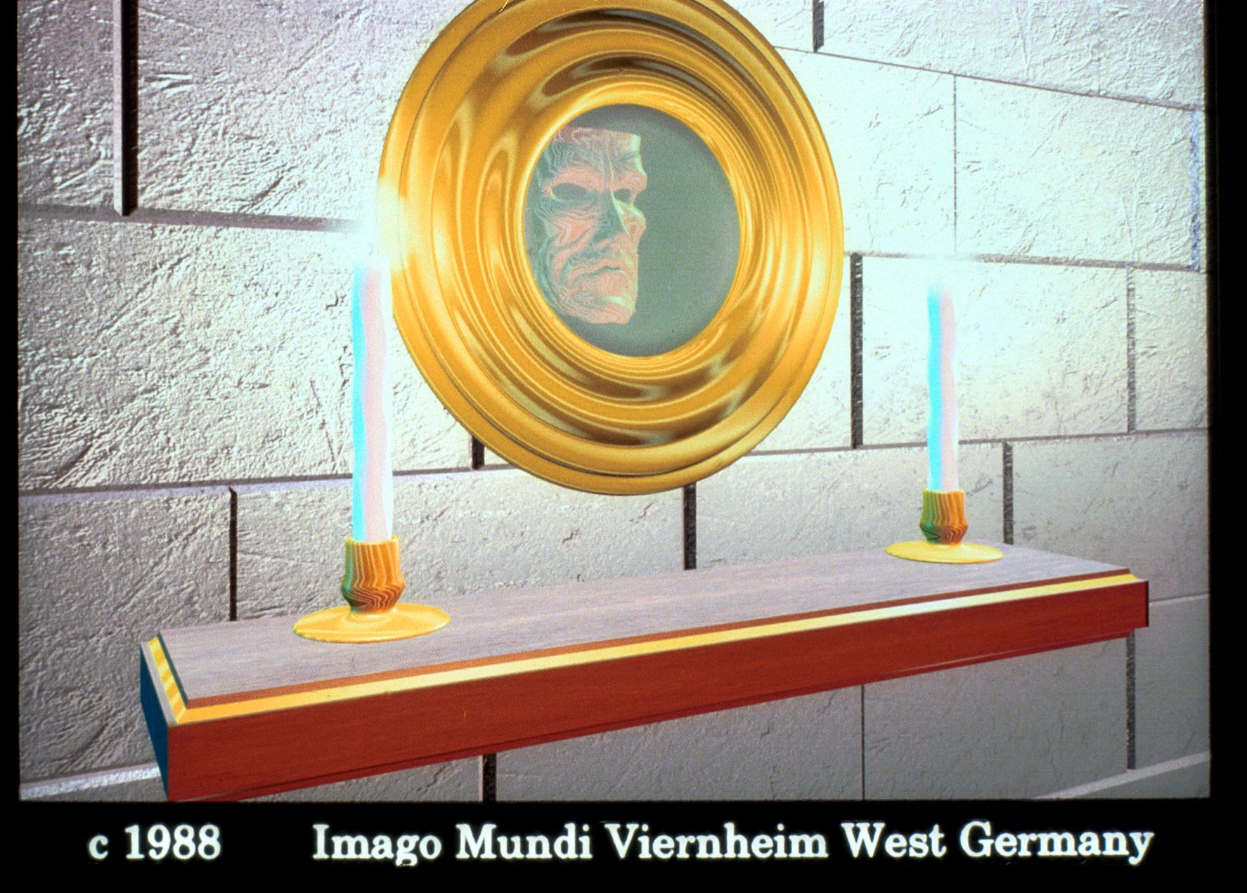 - Mirror Mirror by Jim Hillin, Ken Cope, Geoff Fennell and Frank Little using Digital Arts DGS v 2.0 on a Everex 1800 AT, Intel above board, Targa 32 frame buffer and Definicon Render Engine. This image was the cover for Op1icmusic Film & Video in March 1988. Contact: Jim Hillin, lmageworks, Mr. Film, 1309 Palisades Drive, Pacific Palisades, CA 90272, (213) 459-4292.?