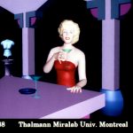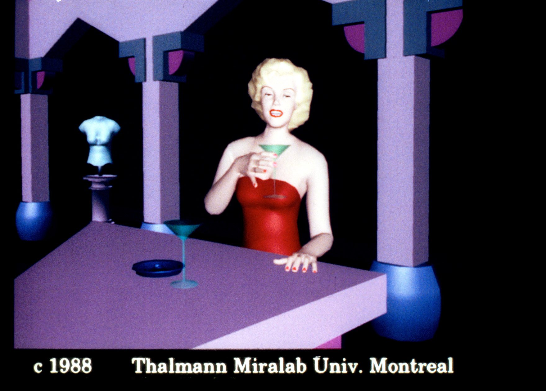 - Glass Grasping by MIRALab, University of Montreal using the software called Human Factory running on the VAX 8600 and Raster Technolgies One/ 80 and Dunn Instruments film recorder. Frame from the film “Rendez-vous Montreal” by N. Magnenat-Thalman and D. Thalmann. Marilyn Monroe grasps a glass using an original “grasp object algorithm,” limb shapes are automatically deformed using JLD (joint-local-deformation) operators. Contact: D. Thalmann, MIRALab., University of Montreal. MIRALab., IRO, University of Montreal. P.O. Box 6128 Station A, Montreal, Canada H3C 377, (514) 343-6794.?