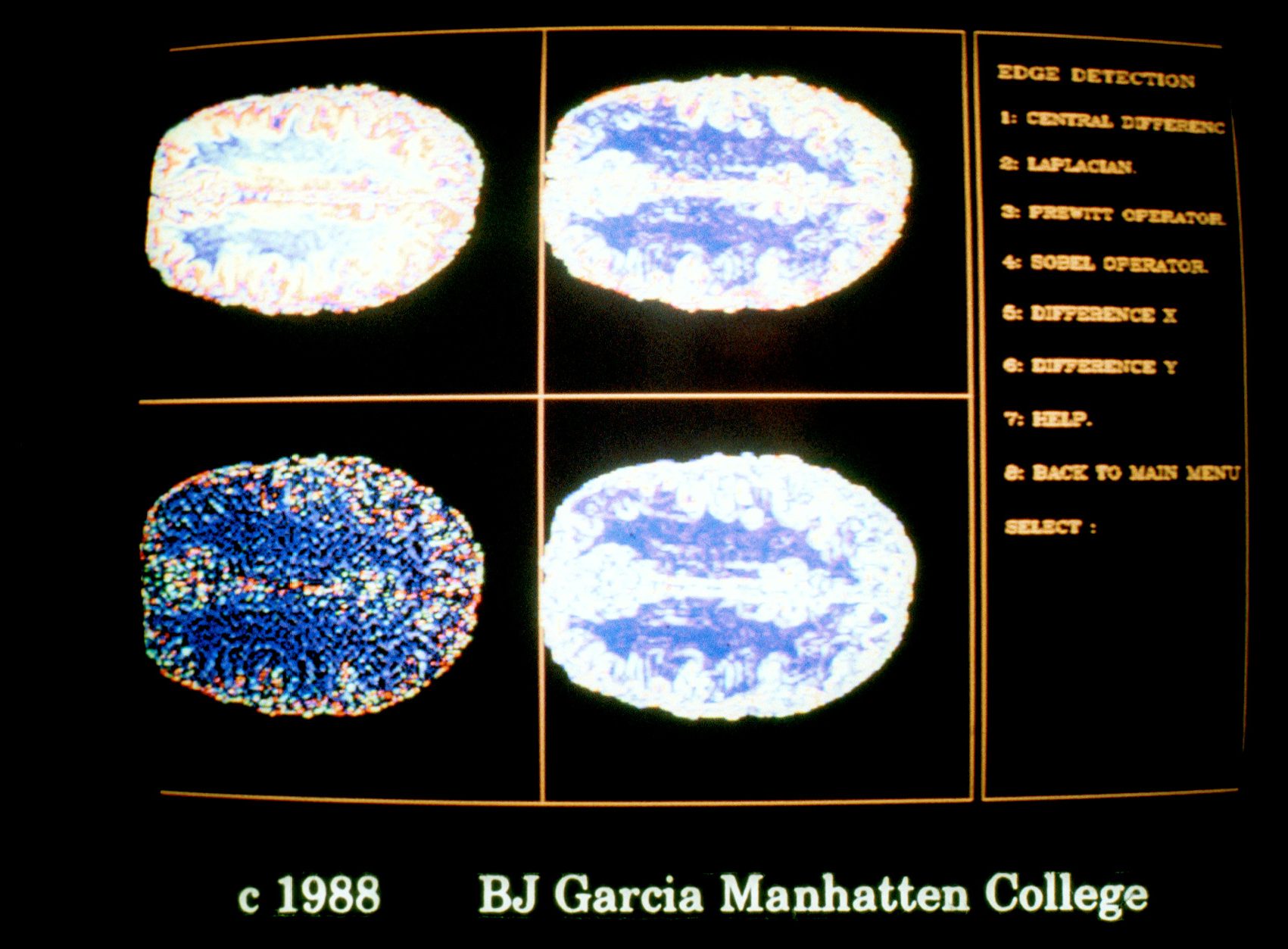 - Magnetic Resonance Images -Brain by B.J. Garcia, T. Horatyshyn and K. Boland using Fortran with Graphical Kernel System (GKS) on the Data General MVI0000 with GDCIO00 graphics terminal. GKSbased image processing was used on magnetic resonance brain scan images. These were unprocessed and then processed with three different edge-detection enhancements. Contact: B.J. Garcia, !Vlanhattan College, Dept. of Elec. Eng., 3840 Corlear Ave., Rircrdule NY I 0471, (212) 520-0383.?