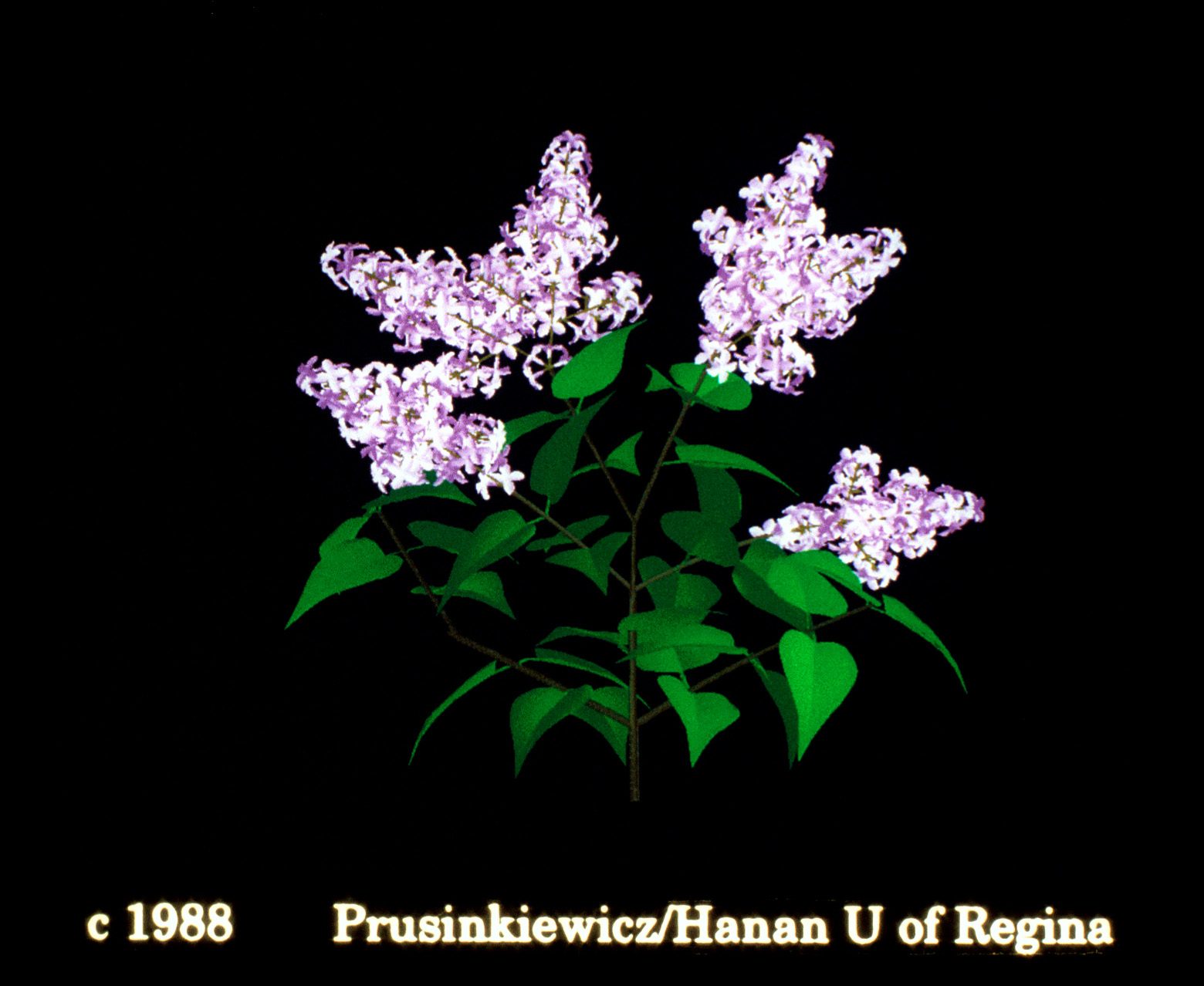 - Lilac Twig by Przemyslaw Prusinkiewicz and James Hanan. In house developed software package for modeling plants, based upon the Lindenmayer systems. Iris 3130 with Matrix 6000 film recorder. The twig architecture is generated by a Linenmayer system which captures the essential topological and geometrical features of “real” lilac twigs. Contact: Przemyslaw Prusinkiewicz, University of Regina, Department of Computer Science, Regina, Saskatchewan S4S 0A2 Canada, (306) 584-406 I.?