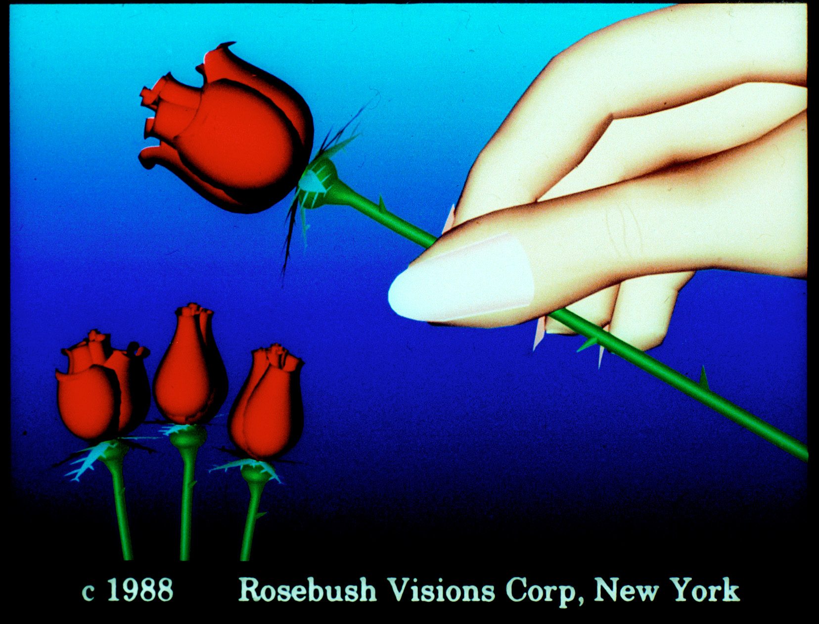 - Hand and Rose by Gail Goldstein, David Tu, Michael Mannix and Caleb Weissleryusing Visions on a Harris 800 CPU with Dicomed film recorder. The hand is a fully articulated model that uses simple generalized software to cross sections onto a skeleton. Provision is made to change the position and shape of the sections as the hand moves. The rose is made with patches and opens from a bud to a full bloom. Contact: Judson Rosebush, Rosebush Visions Corp., 25 West 45th St. NY, NY 10036, (212)398-6600.?