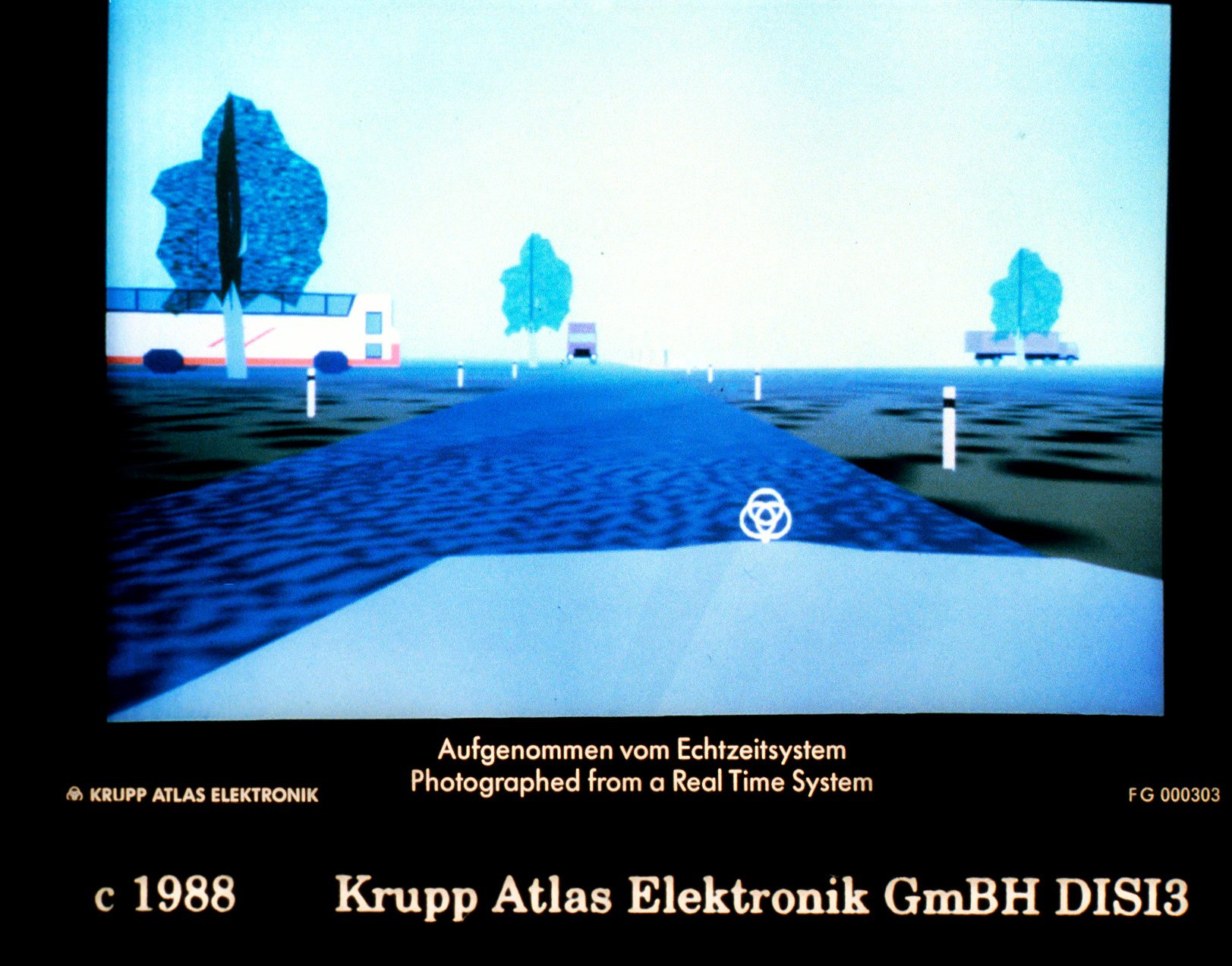 - On the Road by Team DIS I 3 with KAE in-house animation and rendering software on KAE multiple CPU process control computer MP R I 300 and realtime image generator ATLASDIS I 3 with 600x800x24 framebuffer. Image generated with modified scanline algorithm in realtime used for applications. Contact: Hermann A. Hattermann, Krupp Atlas Elektronik GmbH (KAE) Sebaldsbrucker Heerstr. 235, D2800 Bremen, P.O.B. 448545, (421) 457-2170.?
