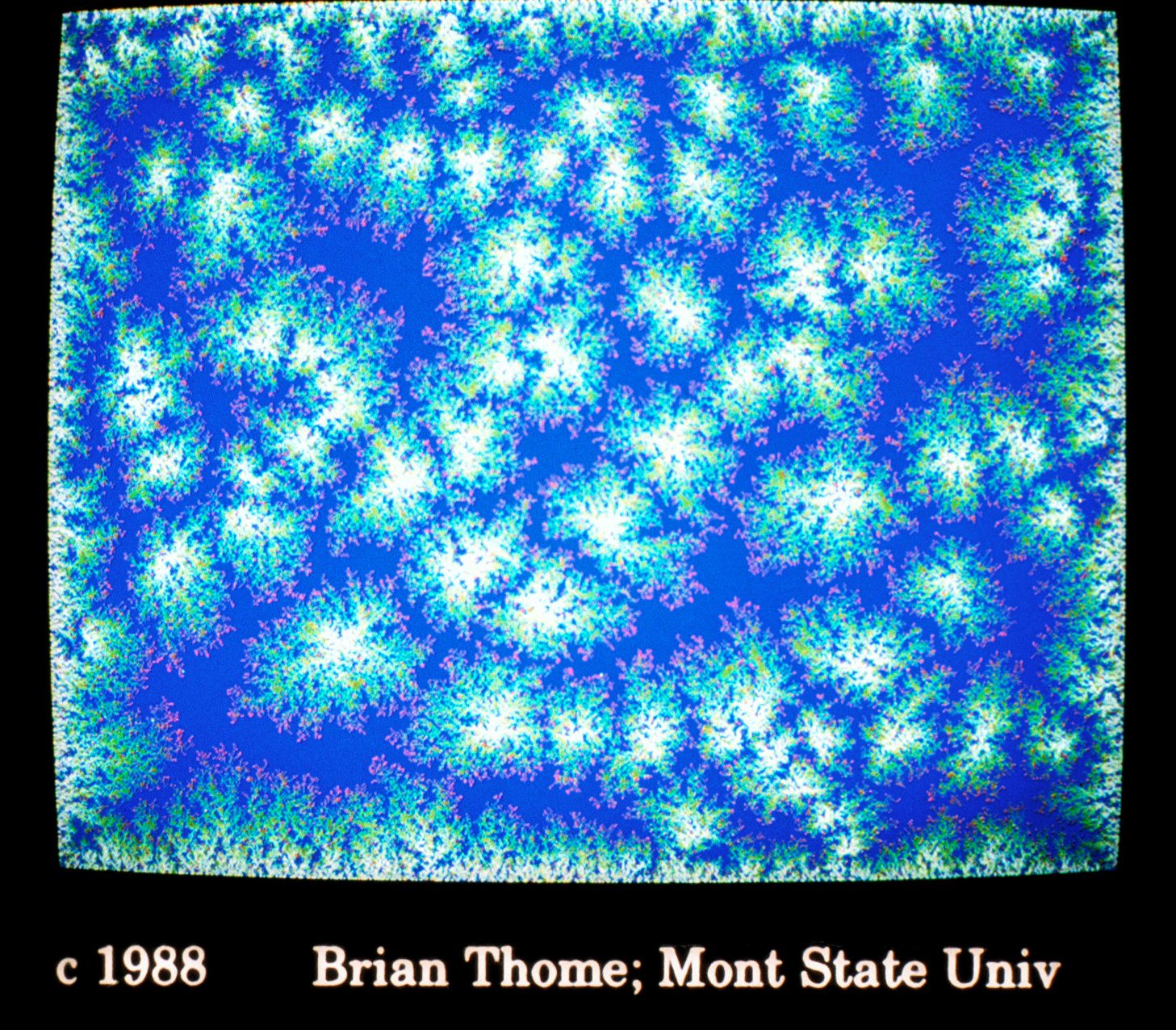 - Fractal Moss by Brian Thome. Inspired by an article entitled “Fractal Growth”by Leonard M. Sander in the Jan. 1987 issue of Sci. Am. generated on a Yax 11 /750 under BSD.2 UNIX at Montana State Univ. A variation on computer simulation of diffusion limited aggregation. Contact: Brian Thome, Yectrix Corp. 2606 Branchwood Dr., Greensboro, NC 27408, (919) 288-0520.?