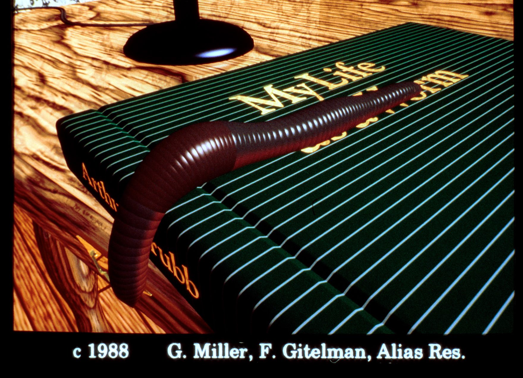 - Eric the Dynamic Worm by Gavin Miller and Freddie Gitelman made on the Alias 2.4 renderer running on the Silicon Graphics 4D / 70 workstation. Thewormdynamics were modeled procedurally. Background scene was modeled interactively. The wood textures are generated procedurally. Cubic environment maps are used for the reflection. Contact: Gavin S. P. Miller, Alias Research, Inc., 110 Richmond St. E., Toronto, Canada, MSC IP I, (416) 362-9181.?