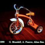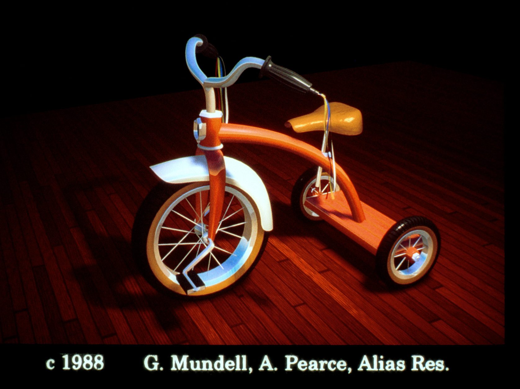 - Easy Rider by Gary Mundell and Andrew Pearce using the Alias/2 modeler and renderer running on the Silicon Graphics 4D/70. Bump mapping, texture mapping and cubic environment maps are applied to a tricycle which is casting an anti-aliased shadow map onto a solid wood textured floor. Contact: Andrew Pearce, Alias Research, 110 Richmond St. E., Toronto, Canada, MSC I Pl.(416) 362-9181.?