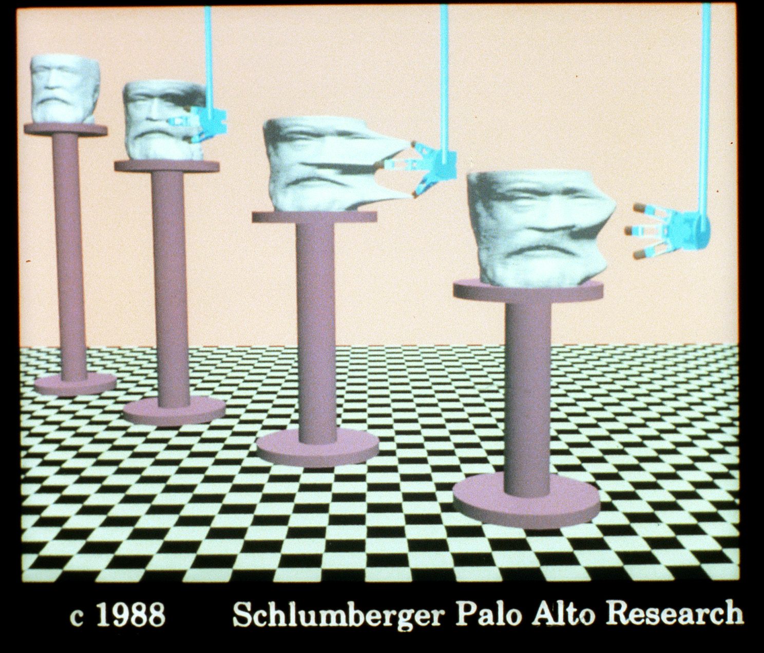 - Machine Interface by Kurt Fleischer and Demetri Terzopoulos using in-house software on Symbolics. A 3D digitized bust of Victor Hugo (from Henri Maitre of ENST Paris vis University of Utah) undergoes a simulated elastoplastic deformation. Four images in sequence are shown with robot hand. Contact: Kurt Fleischer, Schlumberger Palo Alto Research, 3340 Hill Ave., Palo Alto, CA 94306, (415)496-4614.?