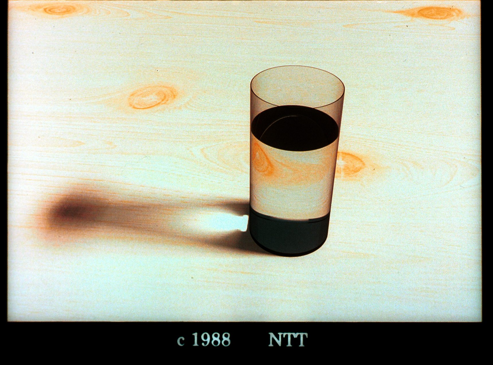 - A Glass of Water by Mikio Shinya with in-house software running on the VAX 11 / 780. This image was rendered by pencil tracer. Tracing light pencils and application of the illuminance formula successfully simulated the illuminance pattern focussed by the glass. The light source was rectangular. The image was generated on a VAX 11 ? 780 at a resolution of 2048xl 366. Contact: Mikio Shinya, Nippon Telegraph and Telephone, Visual Media Laboratory. NTT Human Interface Laboratories. 1-2356, Take. Yokosuka-shi. Kanagawa. Japan, 81-468-59-4716.?