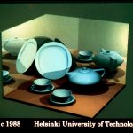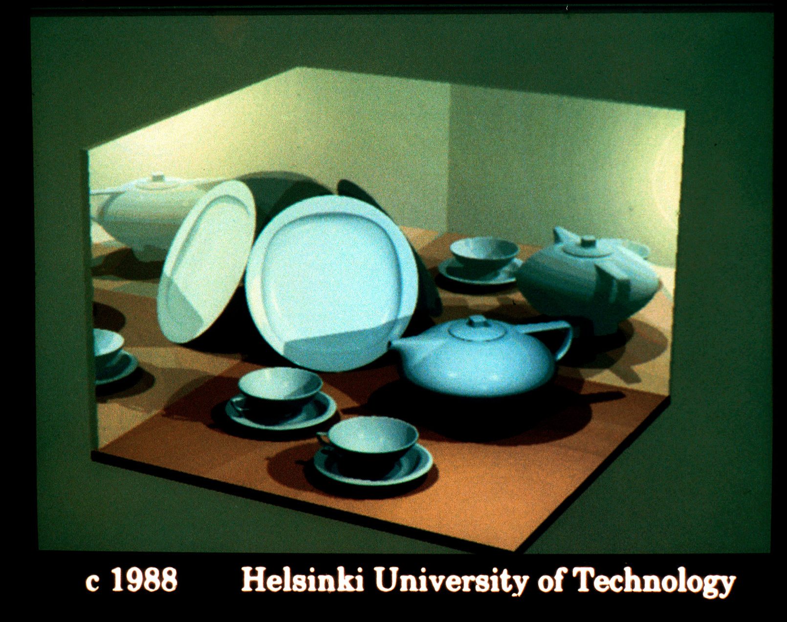 - Tea Set in Mirrors by T. Slotte (Arabia Ltd.), C. Woodward and P. Re kola (HUT) using CUBIX modeling system. EXTrace ray tracing system, EXCE LL spatial directory on the SU!\i-3 260 with a 8-bit frame buffer. Models were designed as B-spline surfaces and converted to Bezier form for rendering. Surface patches were subdivided dynamically for each intersecting ray with no preprocessing. Ray-tracing was accelerated with spatial index to the object space. Contact: Panu Rekola. Helsinki University of Technology, Laboratory of Information Processing Science. Otakaari I SF-02150 Espoo FINLAND, 358-0-451258.?
