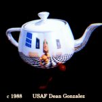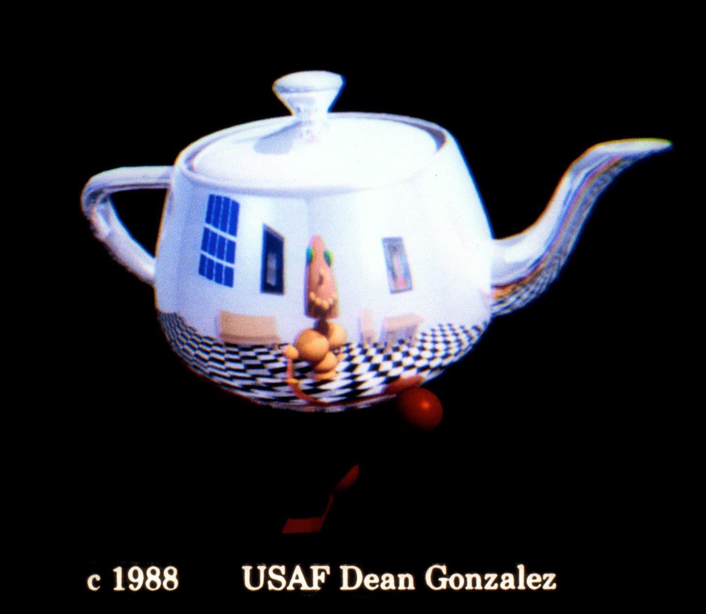 - Hand With Reflecting Teapot by Dean W. Gonzalez with locally developed ray tracing renderer running on the Data General MY 10000 computer with Ramtek 9460 display device. The classical teapot model is held by a robot whose reflection is seen. Also. the surrounding room’s refl: ction is visible in the teapot. This image was inspired by M. C. Escher’s artwork, “Hand With Reflecting Globe.” Contact: Dean Gonzalez. The Dept. of Computer Science, USAF Academy. Colorado Springs. CO 80840-4701, (719)472-2136.?
