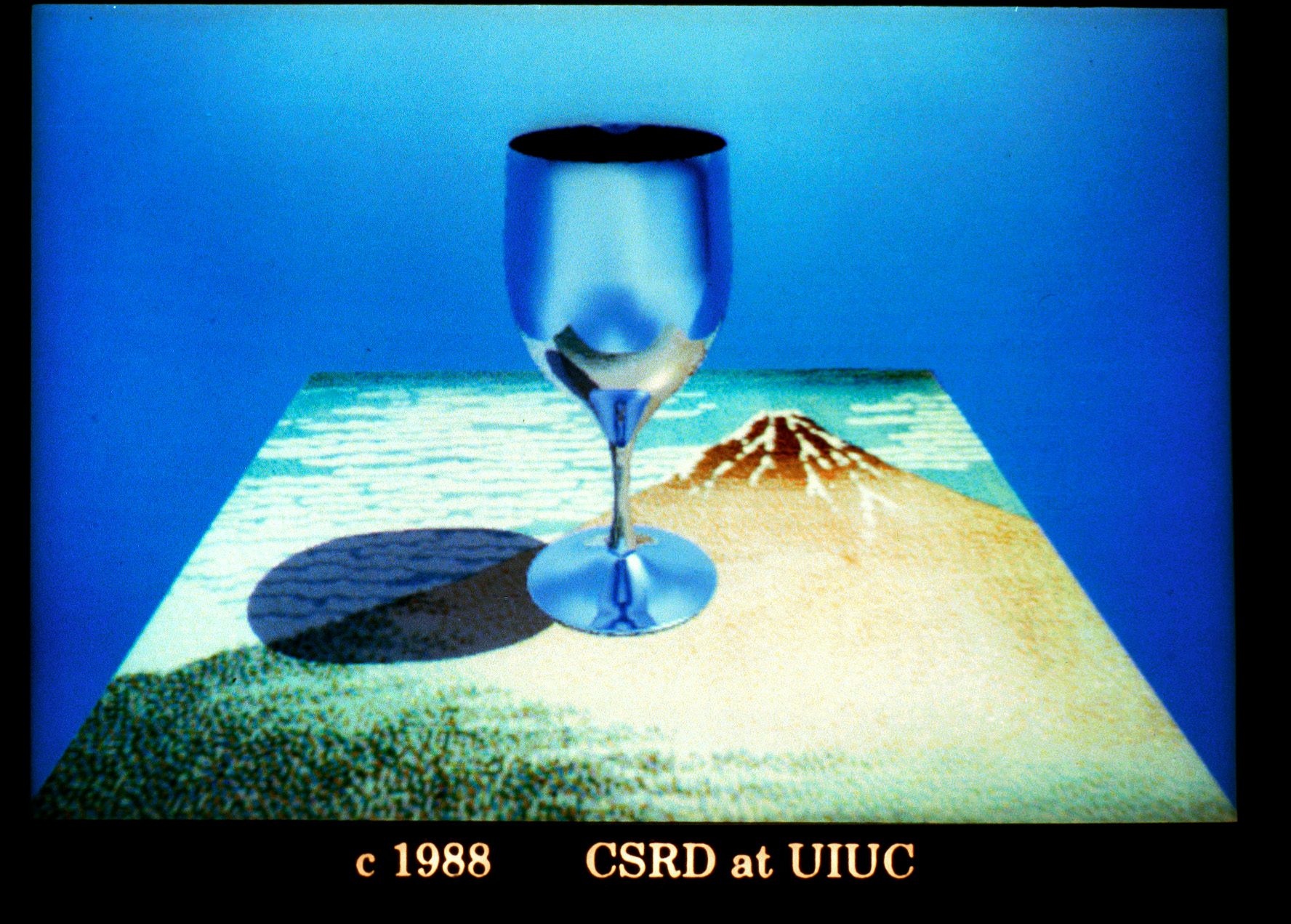 - Steel Glass by Peter Shirley using CSR D ray tracer on the Alliant FX/8 and Pixar image computer. This image of a metal glass was ray traced concurrently on eight processors. The glass is a tessellated surface generated from a surface of revolution. Contact: Allan Tuchman,Centerfor Supercomputing Research and Development, 305 Talbot Lab. 104 South Wright, Urbana, IL 61801. (217) 244-0048.?