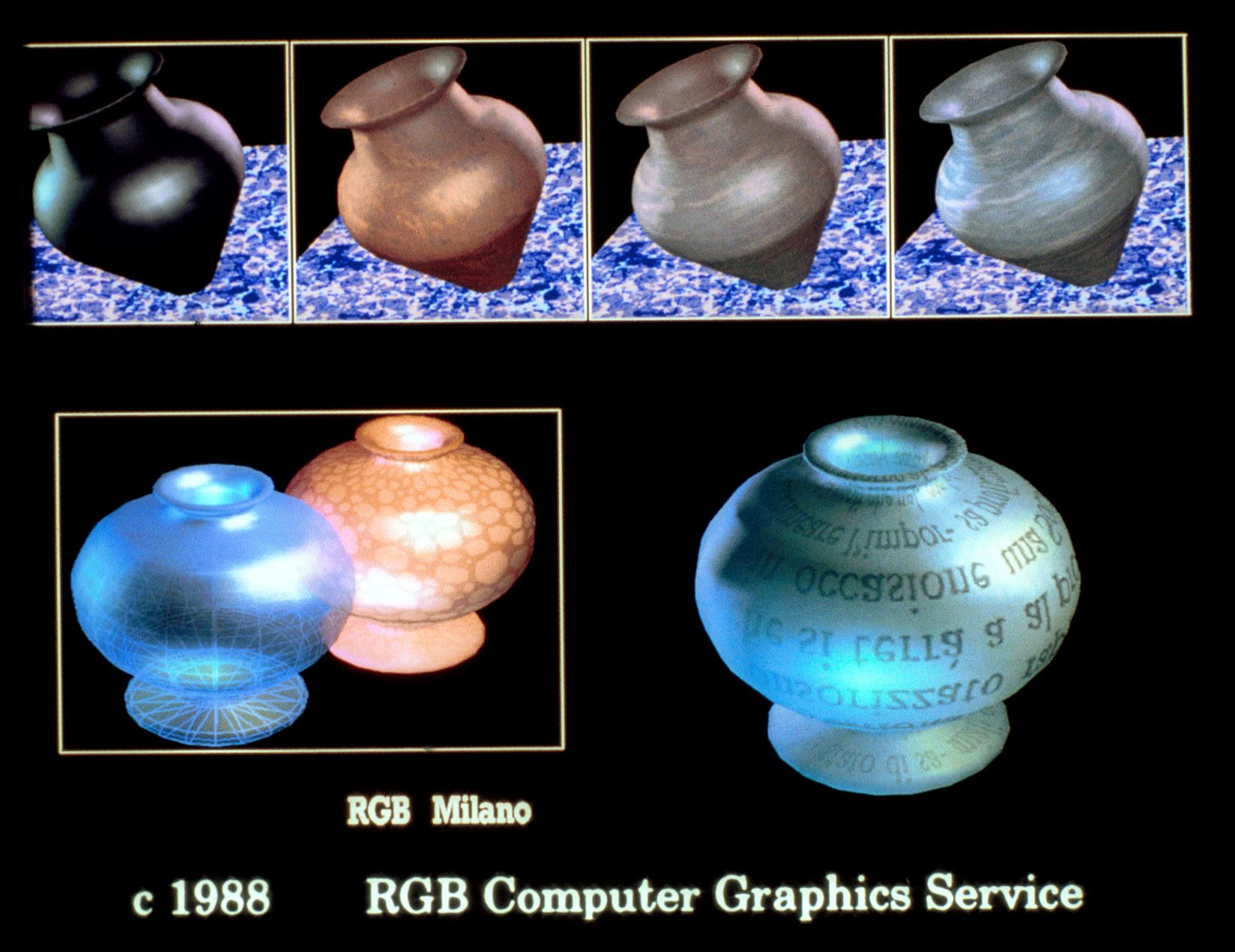 - Vases by Massimo Ontani using Crystal 30 and Lumena 16 software on an IBM PC/ AT compatible. This is a study of texture mapping on various solids. Contact: Tullia Redaelli Sprfafico. RGB Computer Graphics Service, Viale Piave 17Milano Italy, 027 83.992.?
