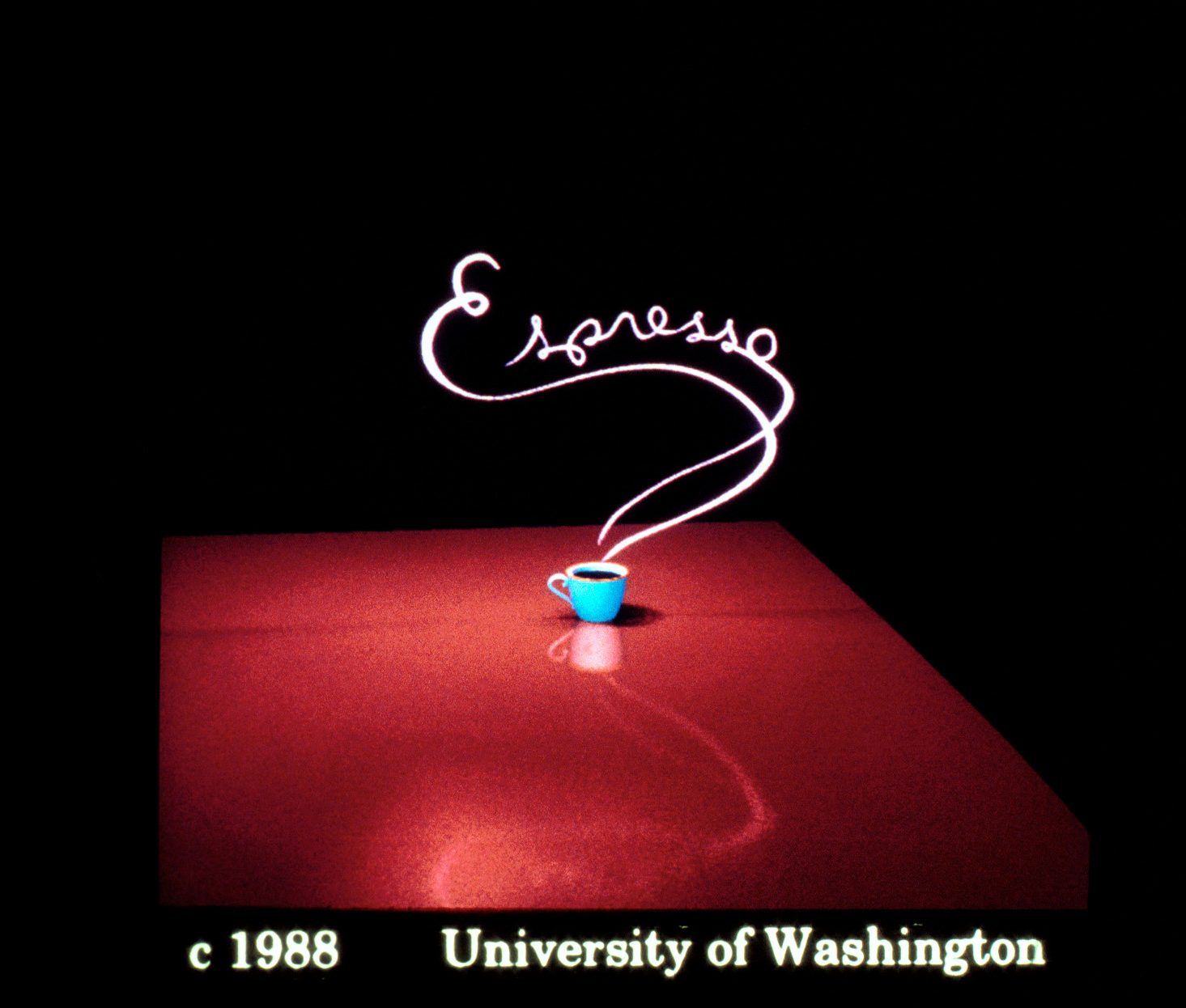 - UntitledbyTonyDeRoseand Dan O’Donnell. The slide demonstrates a new techniquefor modeling light sources as geometric solids. The image contains only one light source-the espresso sign-and is constructed from two free-form surfaces. Produced on an Adage 3130 and VAX 8550. Contact: Tony DeRose, University of Washington. Department of Computer Science, FR-35. Seattle WA 98195.?
