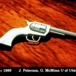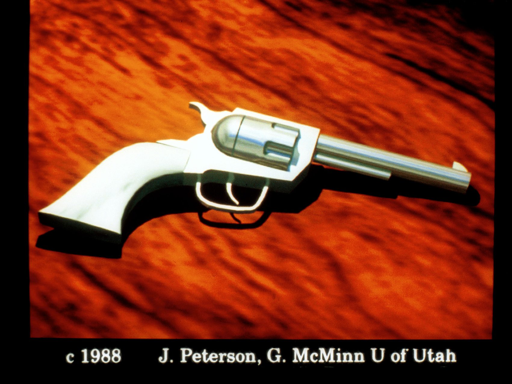 - Revolver by John Peterson. Glenn McMinn. University of Utah on Alpha-I geometric design system using VAX 11 / 785, E&S PS 300, Grinnell frame buffer and Matrix camera. The gun was modeled with B-spline surfaces (NURBS). It was rendered with a ray tracing package that supports texture, reflection and shadows. Contact: John Peterson, Apple Computer, 20525 Mariani Ave, MS 32E. Cupertino, CA 95014, (408) 973-6124.?
