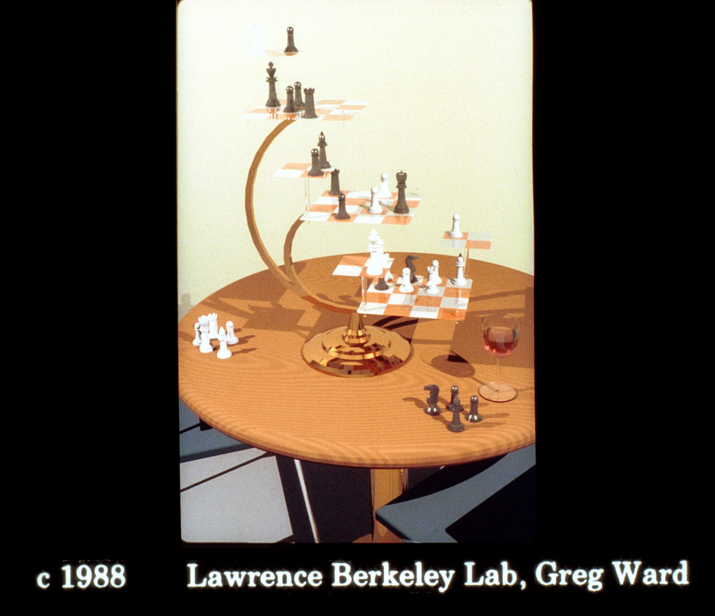 - Tridimensional Chess by Greg Ward and Christopher Moll using RADIANCE custom ray tracing software on a Sun 3 with a Dicomed film recorder. Checkmate position in classic Star Trek game. Chess boards are translucent. The wine is pink chablis. Contact: Greg Ward, Lawrence Berkeley Laboratory, I Cyclotron Road 90-3111, Berkeley, CA 94 720, (415 )486-4757.?