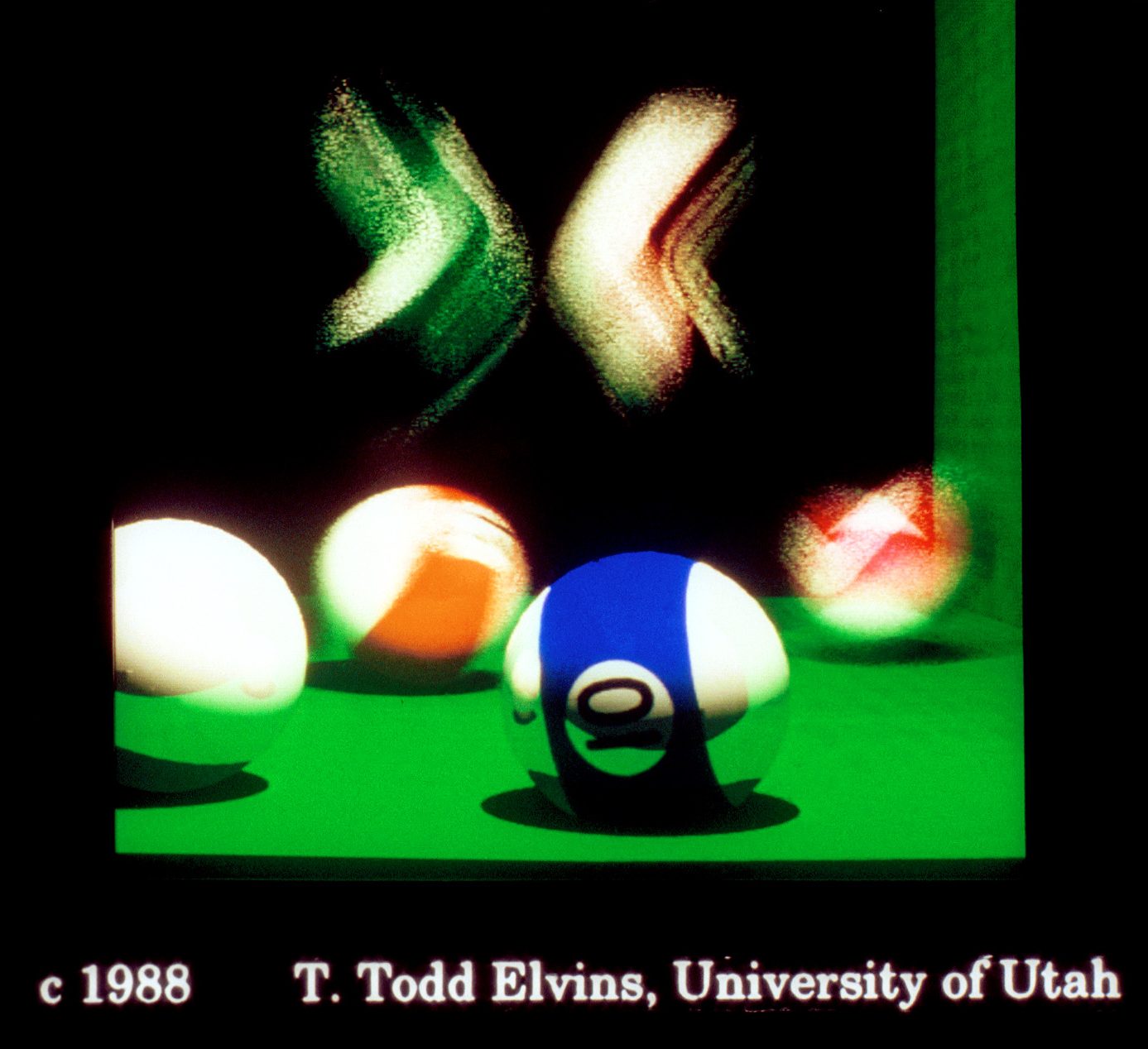 - Dynamic Pool Balls by Todd Elvins using Alpha-I ray tracer “PRT” written by John Peterson on a Sun 3. This is a still from a movie showing dynamic simulation of pool balls in motion. Motion is completely controlled using force and torque calculations. Contact: Todd Elvins. University of Utah, 3190 ME B, Salt Lake City, UT 84 I 08, (80 I )581-5642?
