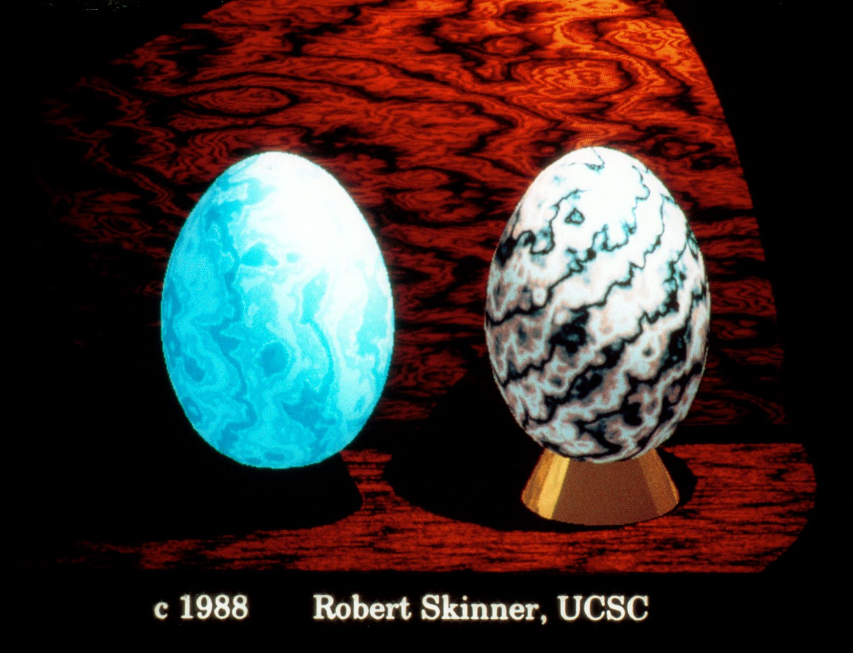 - Lee’s Eggs by Robert Skinner and Cathy Skinner using Optik ray tracing package, University ofT0ronto on an ISi 68020/68881 mainframe and lmagraph frame buffer. The ray tracing package has been extended to create solid textures that are fractal. selfsimilar and band-limited. Contact: Robert Skinner, University of California, Santa Cruz, Computer and Information Sciences, Applied Sciences Building, Santa Cruz, CA 95064, (408)429-4043.?